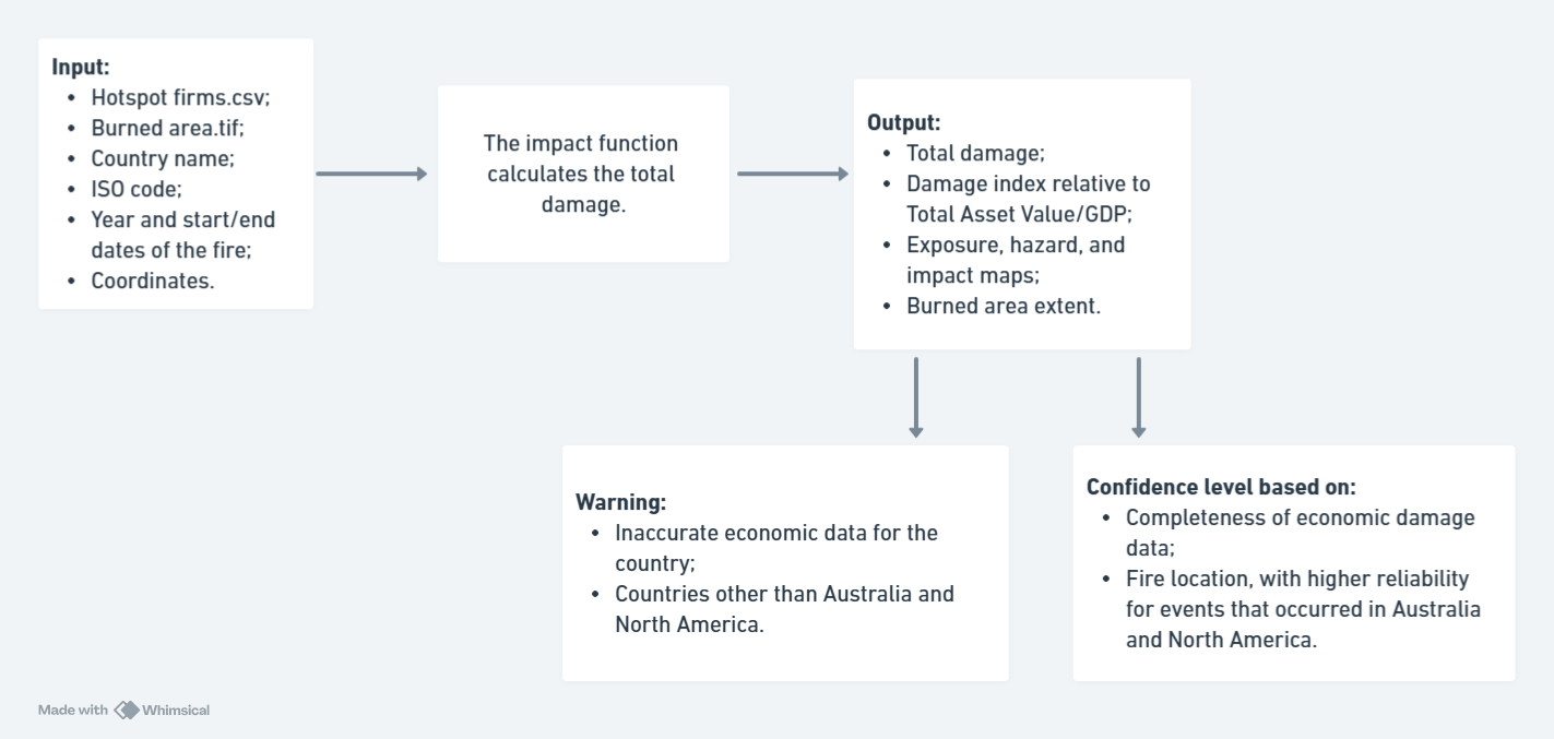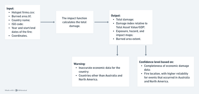 One of CLIMADA’s core strengths lies in its flexibility and global applicability, relying on widely accessible, and often open-source data. During the internship, a prototype of a user-friendly service was developed to make CLIMADA easier to use. With this tool,users can input basic information about a wildfire, such as its location and date, and receive an estimate of the economic damage, the burned area, and maps showing exposure, hazard, and impact. A “confidence level” is also included to indicate potential uncertainty or incomplete data.