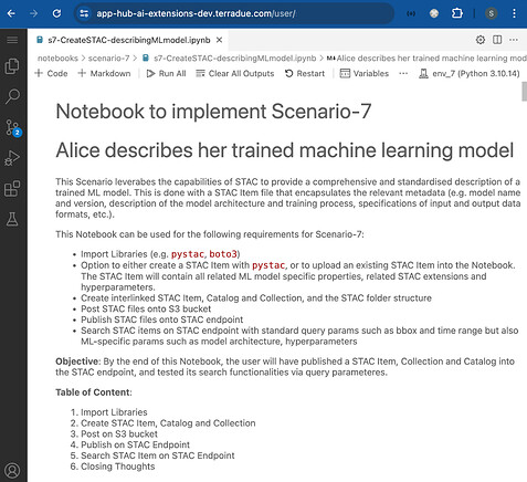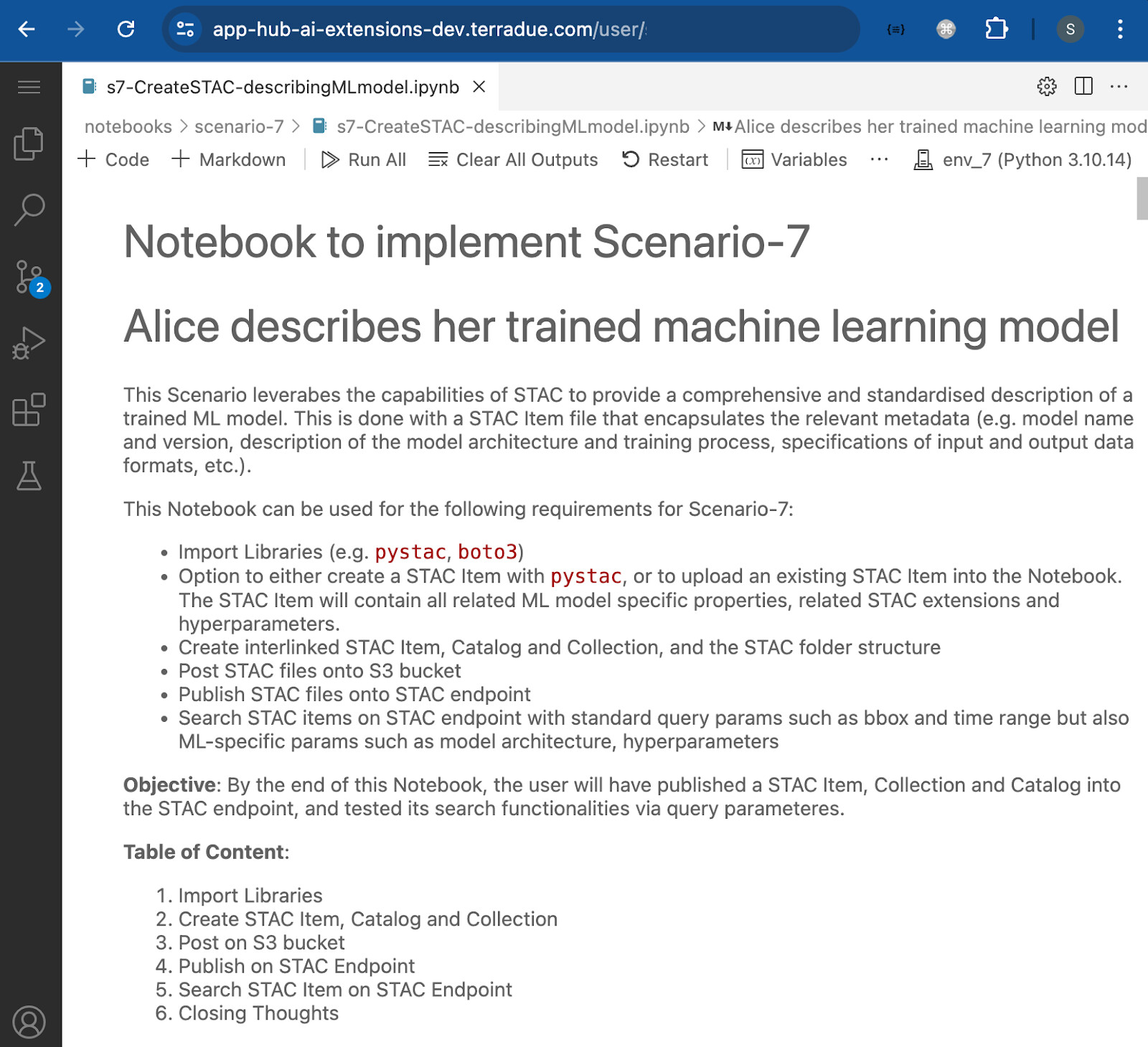pystac or by uploading an existing STAC Item into the Notebook, and its related Catalog and Collection. The STAC Item contains all related ML model specific properties, related STAC extensions and hyperparameters.