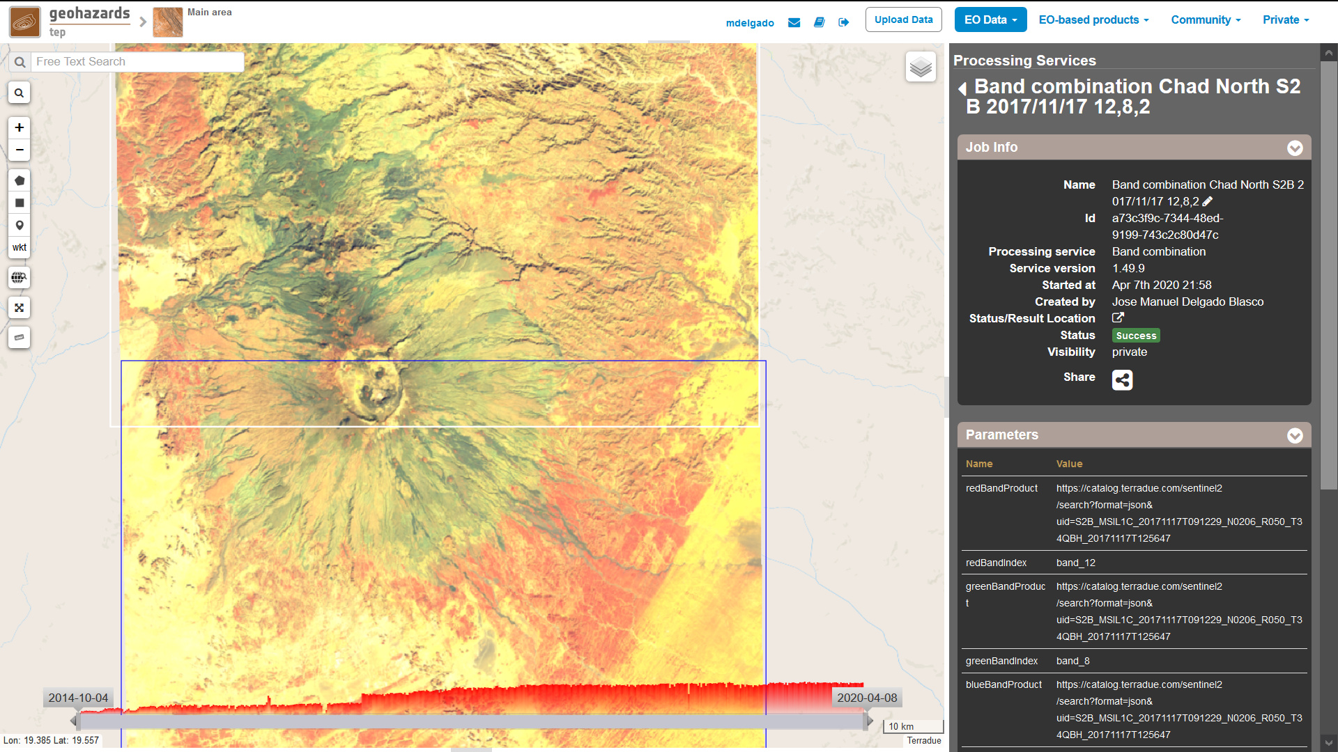 As example, we show the Emi Koussi Volcano viewed by Copernicus Sentinel-2, selecting a false RGB composite using as Red channel (band 11), Green (band 8) and Blue (band 2). This example has been processed by Floriane Provost, Philippe Bally and Jose Manuel Delgado Blasco using the COMBI service available in the GeoHazards TEP.