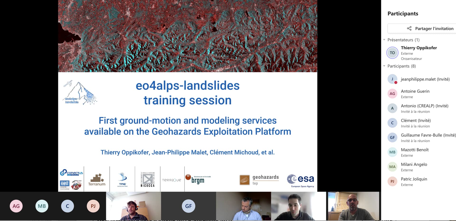 Since early April, on-line demonstrations sessions are currently organized for a series of users (private offices in engineering geology and hazard/risk analysis, geological surveys, public authorities in charge of risk management); these sessions target the training on several optical and SAR ground motion and modelling services accessible on the eo4alps-landslides App. Fifteen end users from Italy, Switzerland, France and Austria have currently access to 8 services tailored for landslide applications, as well as to third-party advanced products. If you are interested in using the services of the eo4alps-landslides App, read the leaflet and contact us at: info@eo4alps-landslides.eu